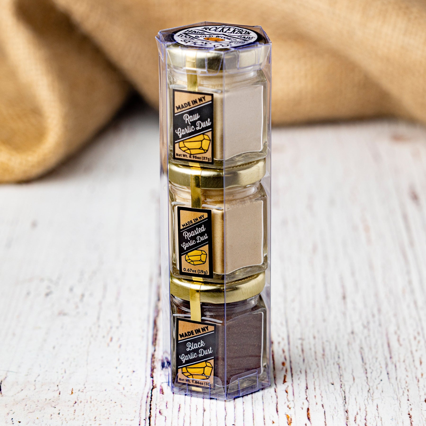 So, you think you know garlic powder? Take it to the next level with all three Rockerbox Garlic Dusts: Raw, Roasted, and Black. The common thread between these three garlicky gems is they’re only one ingredient each: GARLIC… but their flavor profiles are all distinct.